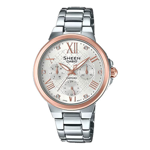 【CASIO 卡西歐】三眼女錶 不鏽鋼錶帶 銀 防水50米 藍寶石玻璃鏡面(SHE-3511SG-7A)